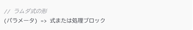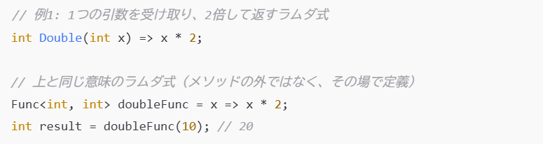 ラムダ式とは「名前のない小さなメソッド(無名メソッド)」を、簡潔な記法で書くための構文です。