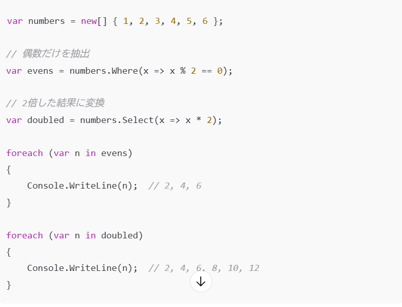 C# のラムダ式は、.NET 3.5 以降ずっと使われてきた機能ですが、.NET 8 でも LINQ や最小 API(Minimal API)などで日常的に登場する、非常に重要な構文です。