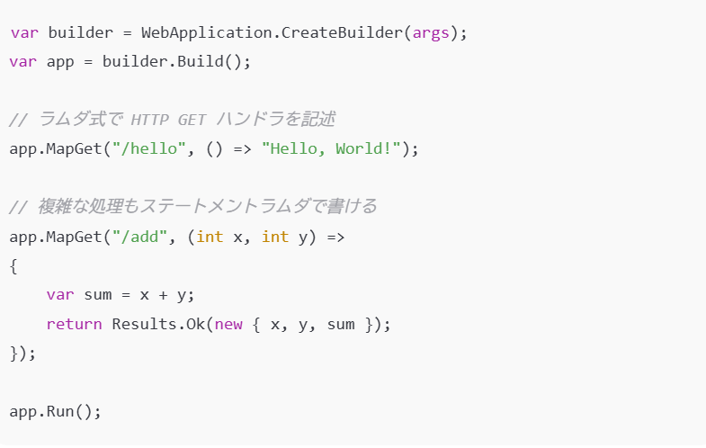.NET 6 以降で導入された Minimal API では、ラムダ式をそのまま HTTP ハンドラとして利用することが多く、.NET 8 でも基本的な使い方は同じです。