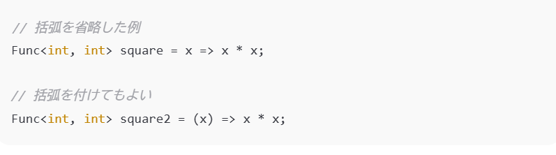 =>を使い、(パラメータ) => 本体の形で記述する。- 式ラムダ(1行)とステートメントラムダ(複数行)がある。