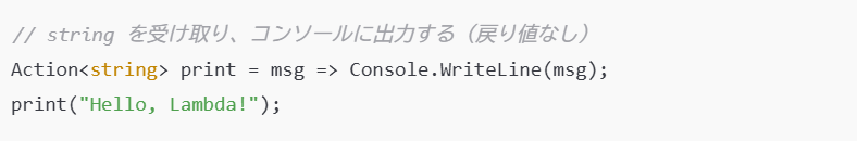 C# のラムダ式は、デリゲート(メソッドへの参照)に代入して使うことが多いです。